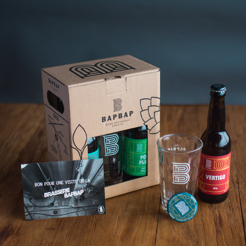 1 Vertigo (IPA complexe, à la robe caramel et à l’amertume franche), 1 Poids Plume (Session Pale Ale vous apportant goût et fraicheur), 1 Toast (Porter au nez frais et chocolaté), 1 Originale (La Pale Ale best-seller de BAPBAP), 1 décapsuleur BAPBAP, 2 verres sérigraphiés de 25cL